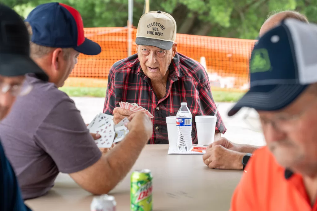 Eugene Burke has been playing Sheephead all his life. In this round, he faced off against Andy Hartings, Dan Livingston and Brenda Hildenbrand. While Dan attempted to explain the complicated game to this photographer, a nearby player mentioned they played by Dubois County rules—photo by Matt Crane.