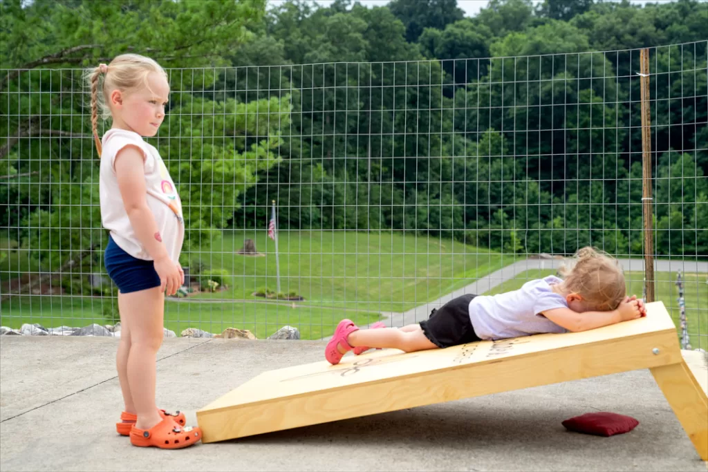 Palmer Linne, 2, and her cousin, Cortland Bretz, 3, hung out at the cornhole contest area Saturday morning at the Streetfest. Palmer lay on her stomach to look through the opening in the board while the girls played together—photo by Amy Crane.