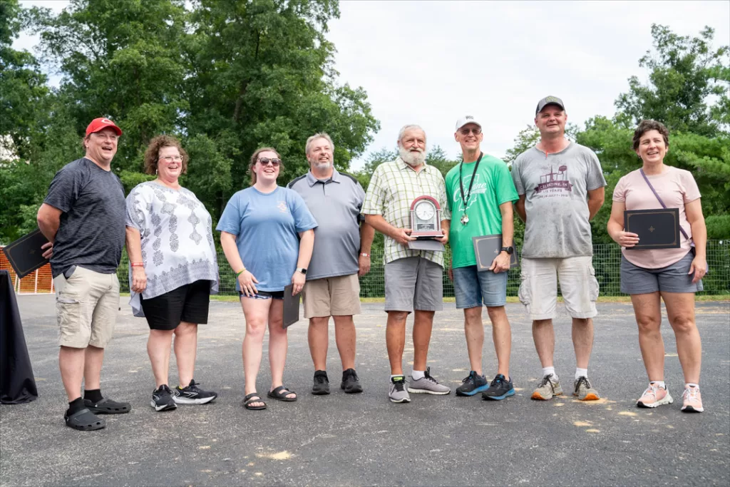 The Celestine Community Park committee celebrates a citizen each year with a Distinguished Service Award presented during the Celestine Streetfest. This year’s nominees included Tony Buechler, Kaddy, Madelyn and Jason Merkel, Glen Schepers, Larry Schepers, Teresa and Jeremy Betz, and Gary Hasenour—photo by Amy Crane.