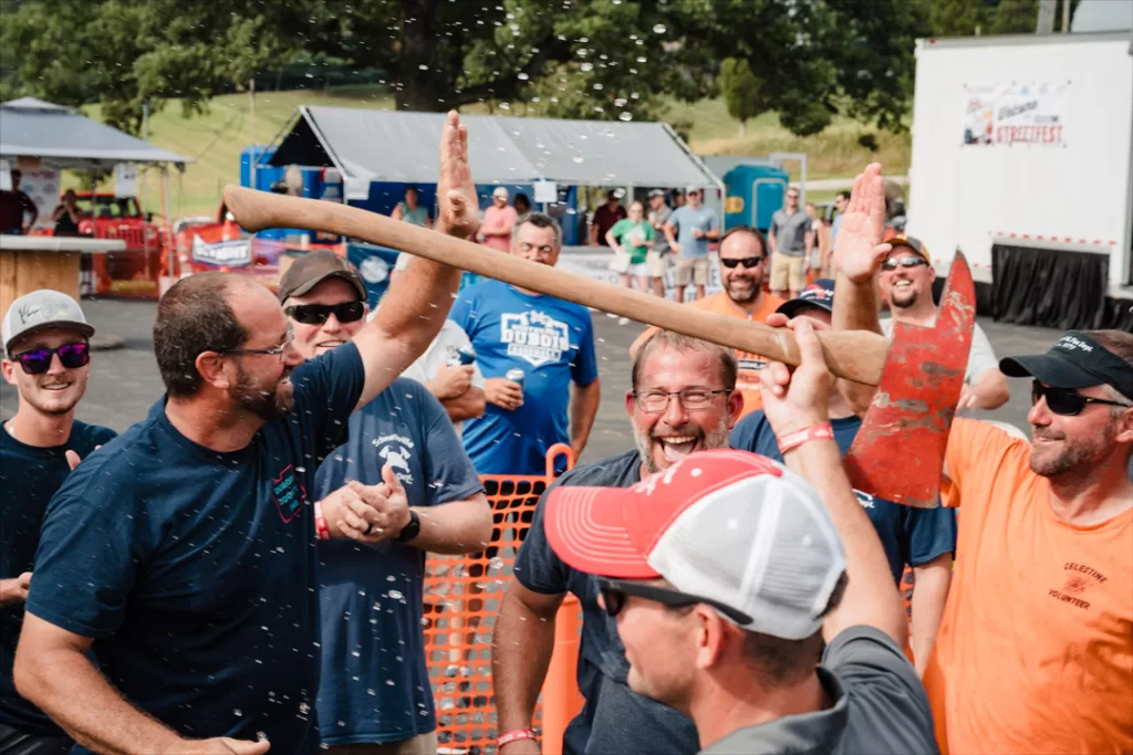 The Celestine Volunteer Fire Department team, comprised of Chris Hasenour, Todd Goepfrich, Kurt Sermersheim, Nick Hasenour, and Pat Hasenour, celebrated their win in the fire truck pull. Chief Ryan Wineinger held up an axe presented to the team for their win. A traveling trophy is being made but was unavailable in time for the event—photo by Matt Crane.