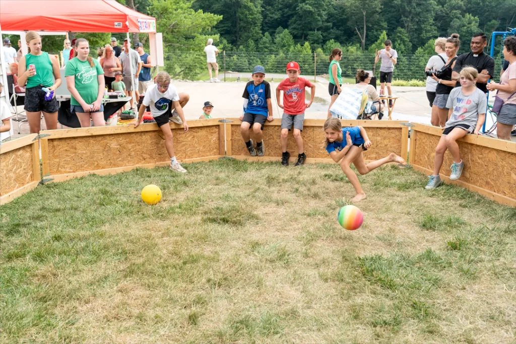 Reagan Merkley, 10, flung a ball across the gaga ball pit during some fierce and fun competition Saturday evening at the Celestine Streetfest—photo by Matt Crane.