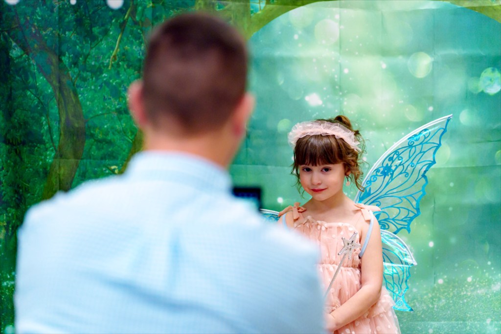 Marra Burris, 4, poses as her dad, Bryan, captures a photo of her at one of the photo stations set up in the school.