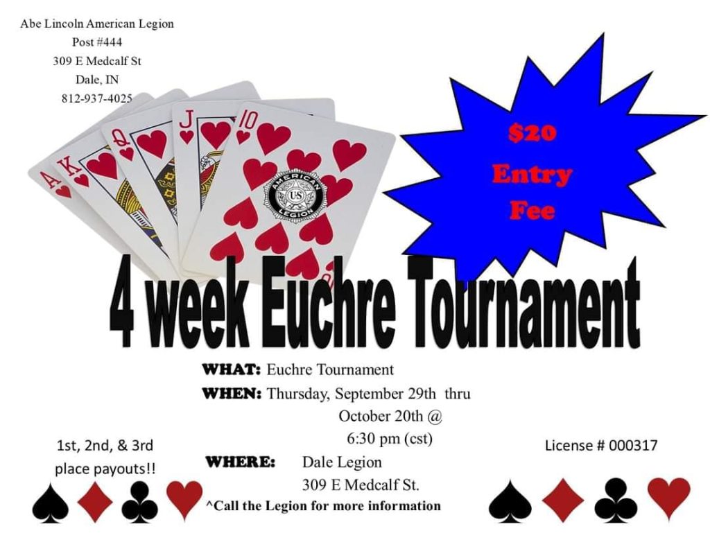 ANNOUNCEMENTS Abe Lincoln American Legion Euchre Tournament set to begin Thursday ByLocal Sources September 28, 2022September 28, 2022 Reading Time: 1 minute Share