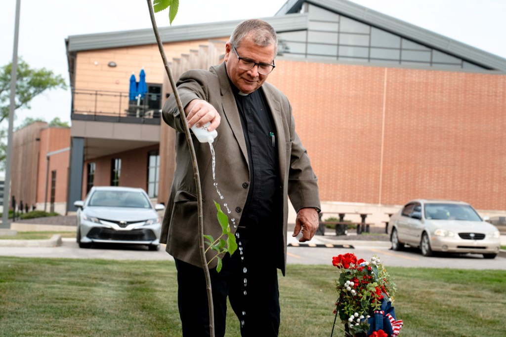 After the tree was planted, Father John Brosmer gave a blessing and sprinkled holy water on it.