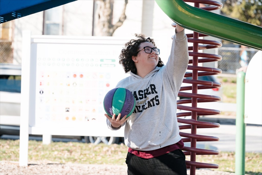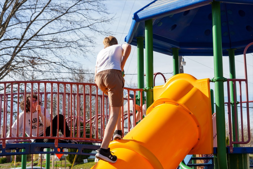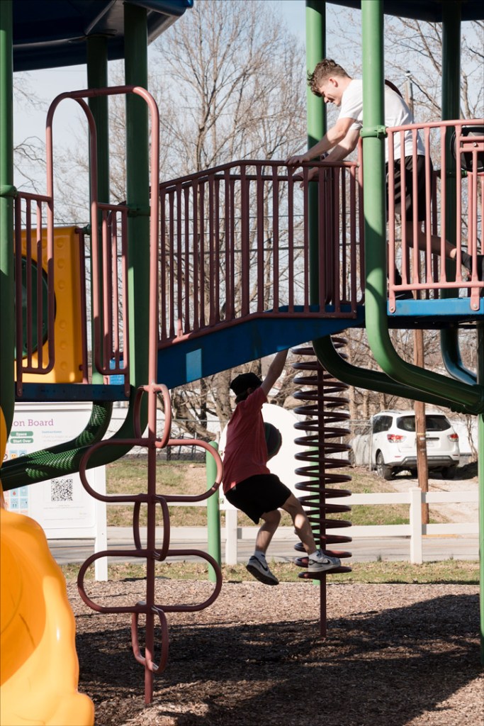 A group of friends meeting up at Robert E. Parker Park in Jasper took over the playground there for some ball tag when the wind kept them from being able to shoot hoops.