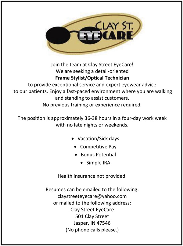 Employment Clay Street Eyecare seeking Frame Stylist/Optical Technician ByAmy Crane April 23, 2026April 23, 2026 Reading Time: 1 minute claystreeteyecare@yahoo.com Share