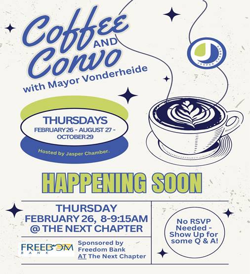 LIVING Coffee and Conversation with Mayor Vonderheide ByLocal Sources February 12, 2026February 12, 2026 Reading Time: 1 minute The Jasper Chamber is hosting Coffee & Conversation with Mayor Dean Vonderheide on Thursday, Feb. 26, from 8:00 to 9:15 a.m. at The Next Chapter in downtown Jasper. Share