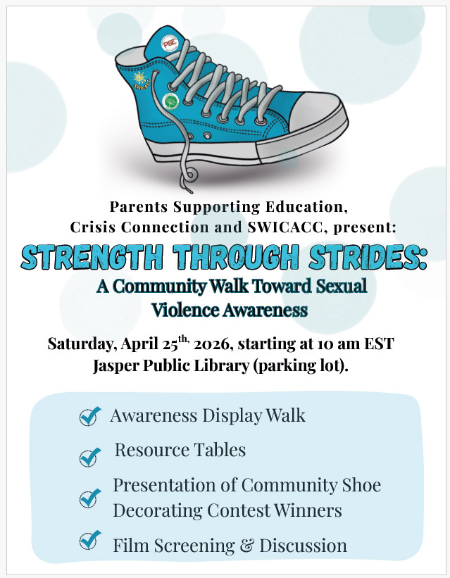 Parents Supporting Education, Southwestern Indiana Child Advocacy Center Coalition (SWICACC), and Crisis Connection, Inc., are hosting “Strength Through Strides”, a Sexual Violence Awareness event. The event will be held on Saturday, April 25, 2026, starting at 10 a.m., in the parking lot of the Jasper Public Library at 100 Third Ave., Suite B, Jasper, IN.