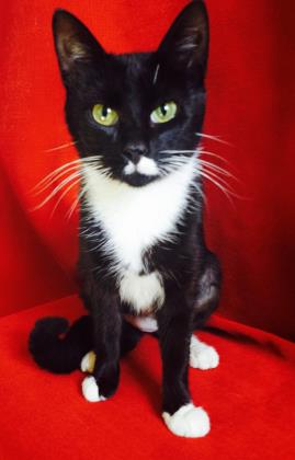 Tilly is a striking black/white Tuxedo cat with green eyes. She is approximately 1 years old, is outgoing, and very playful.