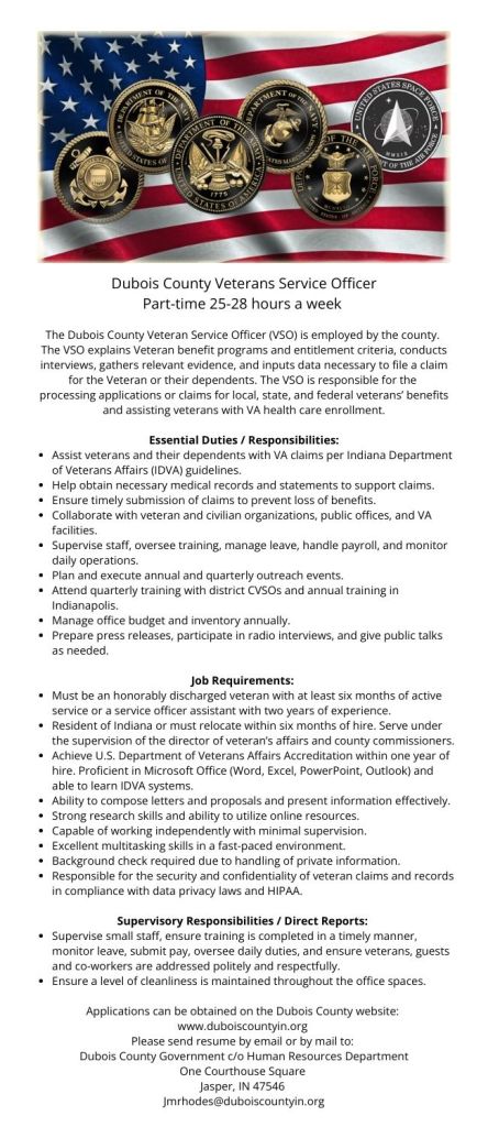 Employment Dubois County seeking Veterans Service Officer ByAmy Crane February 18, 2026February 18, 2026 Reading Time: 1 minute www.duboiscountyin.org jmrhodes@duboiscountyin.org Share