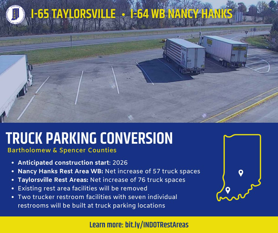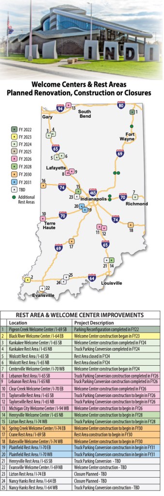The closure is part of INDOT’s 10-year plan to improve interstate rest areas and welcome centers statewide by modernizing facilities, constructing new buildings, improving parking, and converting some to semitruck-only parking. Plans call for an investment of more than $600 million in improvements to 21 rest areas, welcome centers, and truck parking facilities across Indiana by the end of 2034.