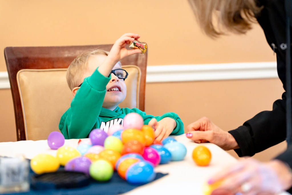 Cade Gunselman, 3, showed his grandmother, Marilyn, a Twix he found in one of his Easter Eggs — Photo by Matthew Crane.