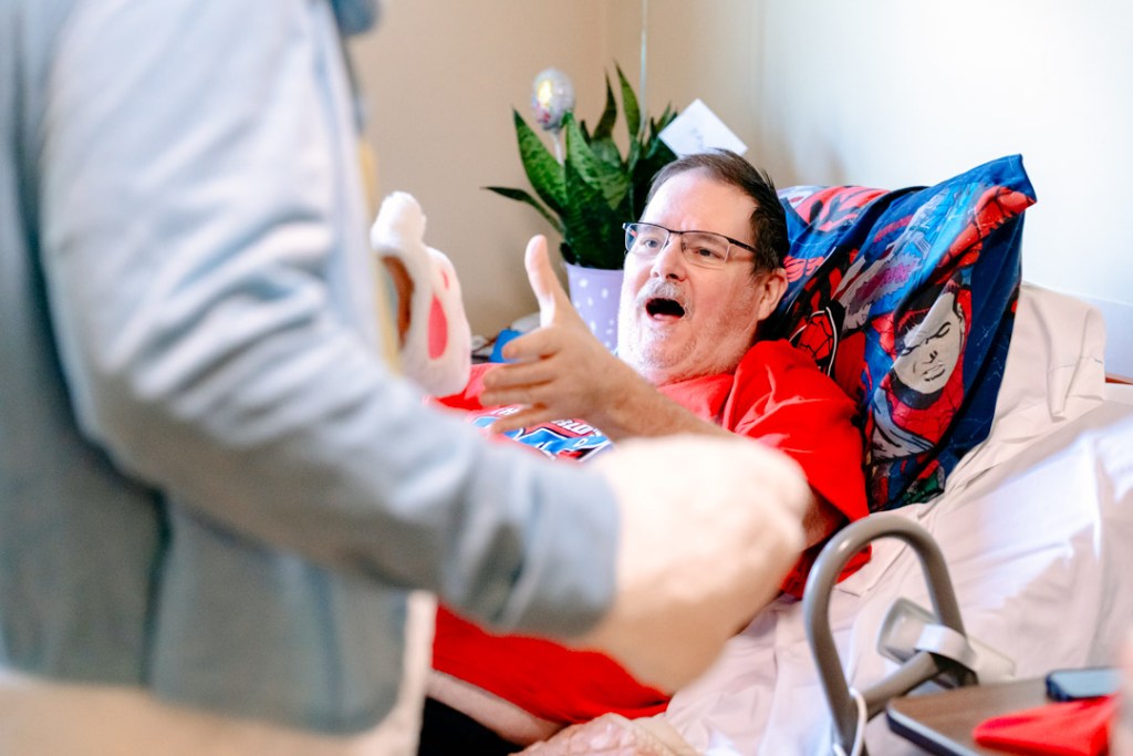 The Easter Bunny (Shane Cooper) stopped by Mike Gentry’s room to say hi. The Easter Bunny made rounds to residents in their rooms if they were unable to attend the gathering—Photo by Matthew Crane.