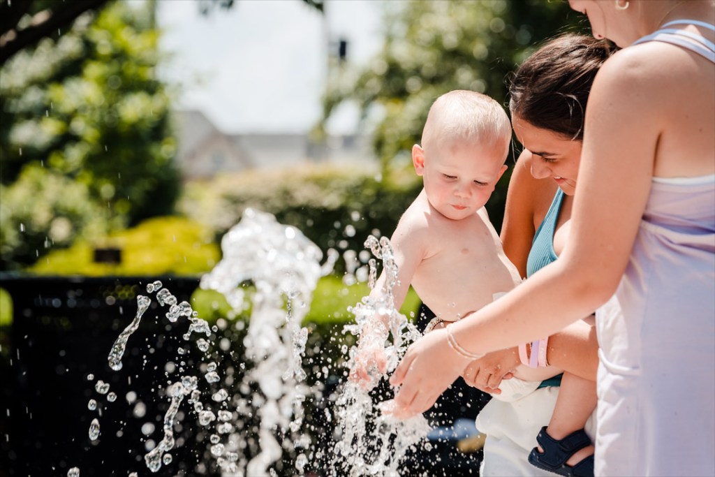 Elliot Schiefer-Temple tentatively dipped his hand in one of the fountains at Central Green today. He was there with his babysitters, Joselin Miranda (holding him) and Adilynn Foster, who took advantage of the shade-covered benches while playing in the water.