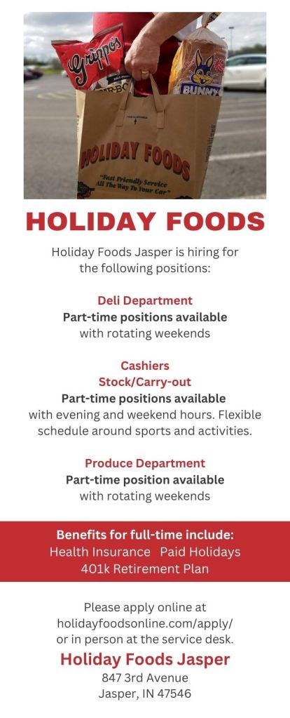 Employment Holiday Foods Jasper hiring for Deli, Cashiers, Stock/Carry-out, and Produce Departments ByAmy Crane January 7, 2026January 7, 2026 Reading Time: 1 minute holidayfoodsonline.com/apply/ Share