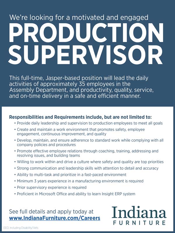 Employment Indiana Furniture seeking Production Supervisor ByAmy Crane April 29, 2026April 29, 2026 Reading Time: 1 minute www.IndianaFurniture.com/Careers Share