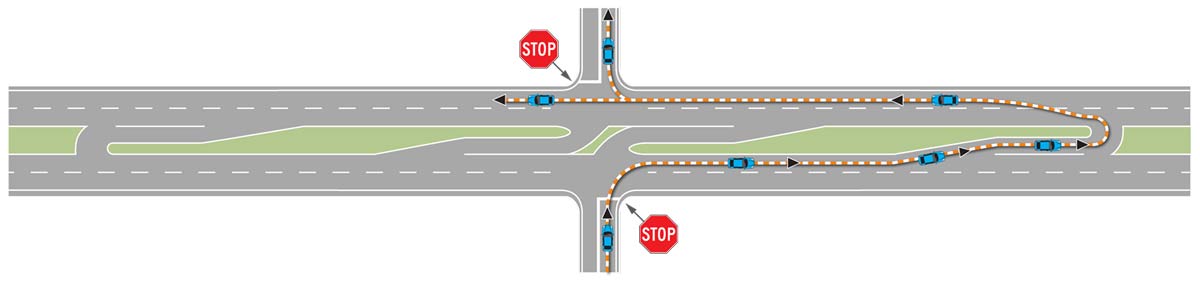 J-turns allow drivers to cross only one direction of traffic at a time, and reduce the number of potential crash conflict points from the current 42 to 24. Where they have been installed in other states, J-turns have reduced crashes by an average of 50 percent. J-turns also reduce severe right-angle or “T-bone” crashes from 24 potential conflict points to four.