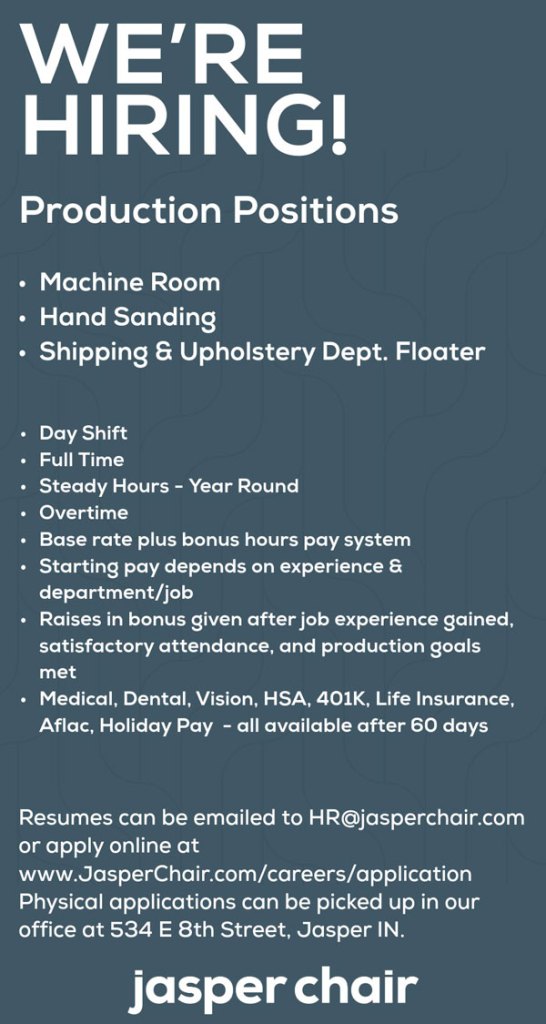Employment Jasper Chair hiring for Production ByAmy Crane March 3, 2026March 3, 2026 Reading Time: 1 minute HR@jasperchair.com www.JasperChair.com/careers/application Share