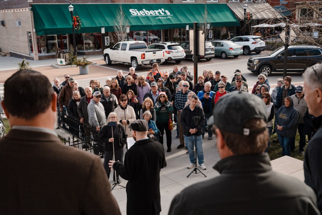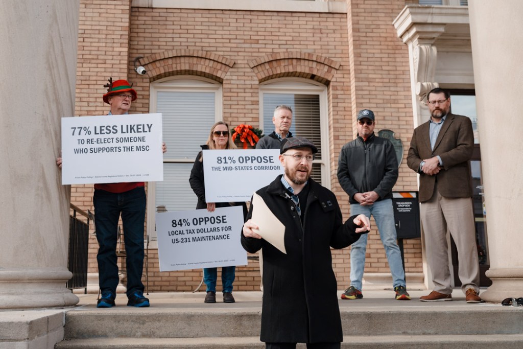Members of the Property Rights Alliance, the Stop the Mid-States Corridor Coalition, and residents gathered at the Dubois County Courthouse to announce the results of a recent poll regarding the proposed highway.