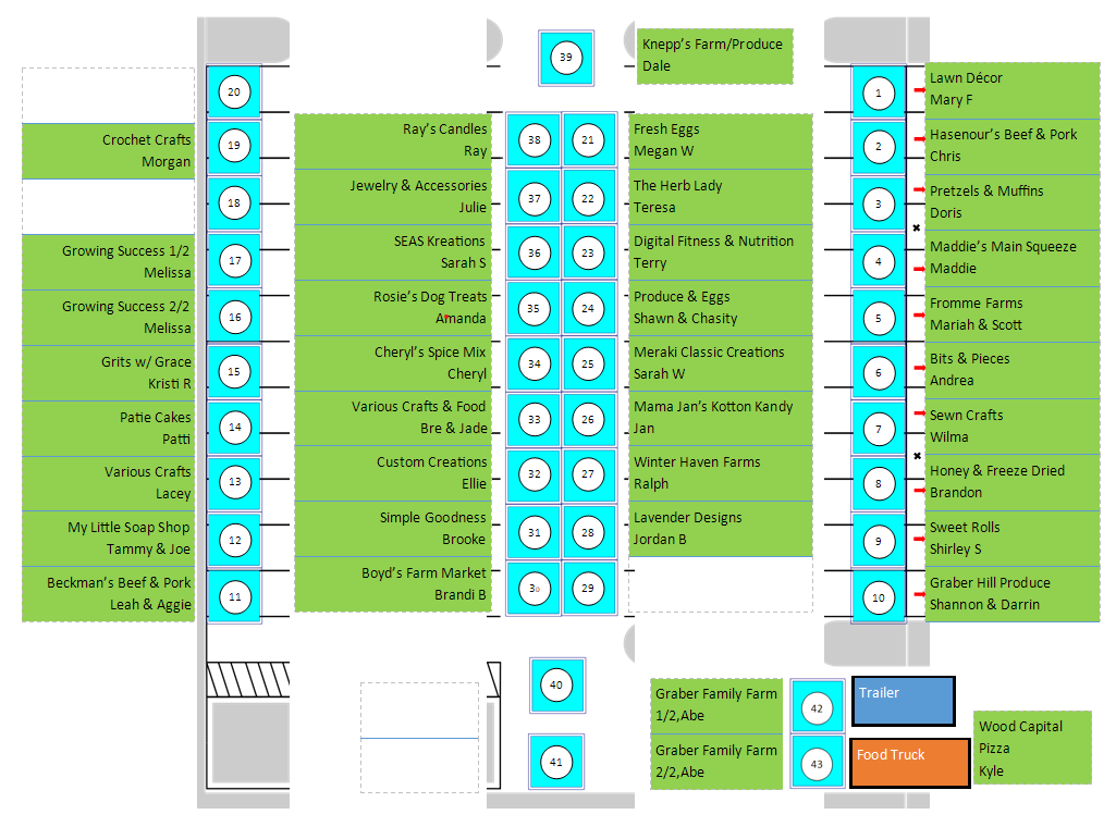Here is a map with tentative vendors. For reference, the Anderson School House is adjacent to spot 43.