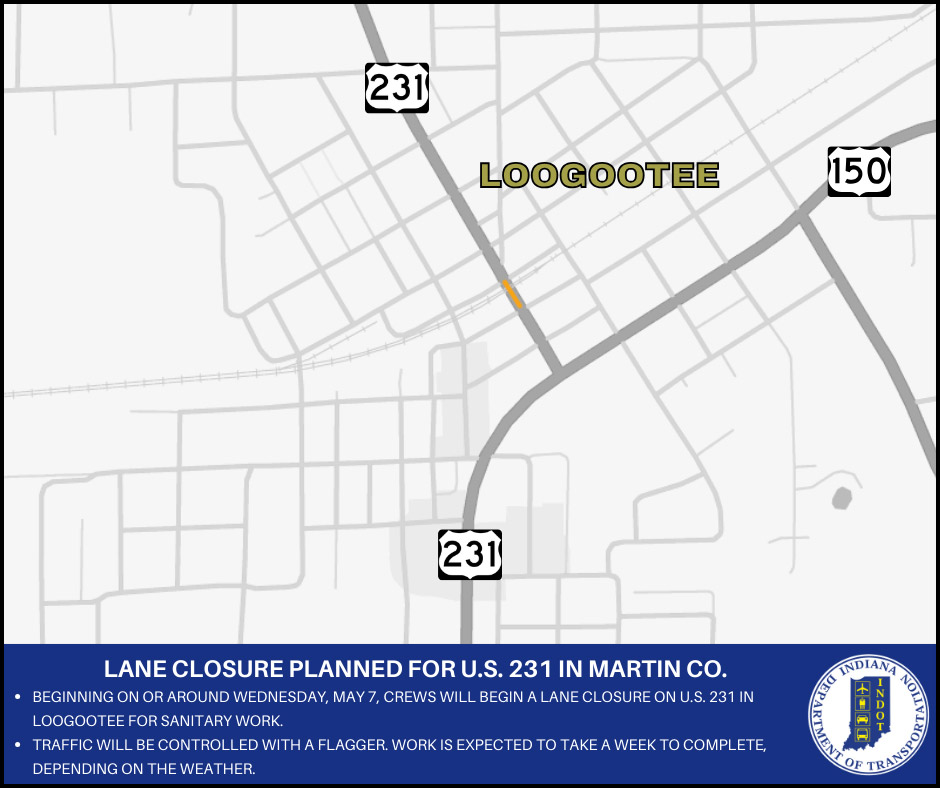 Beginning on or around Wednesday, May 7, crews will begin a lane closure on U.S. 231 in Loogootee. This closure will occur between Church Street and Railroad Street. Work will occur daily between 7 a.m. and 5 p.m.