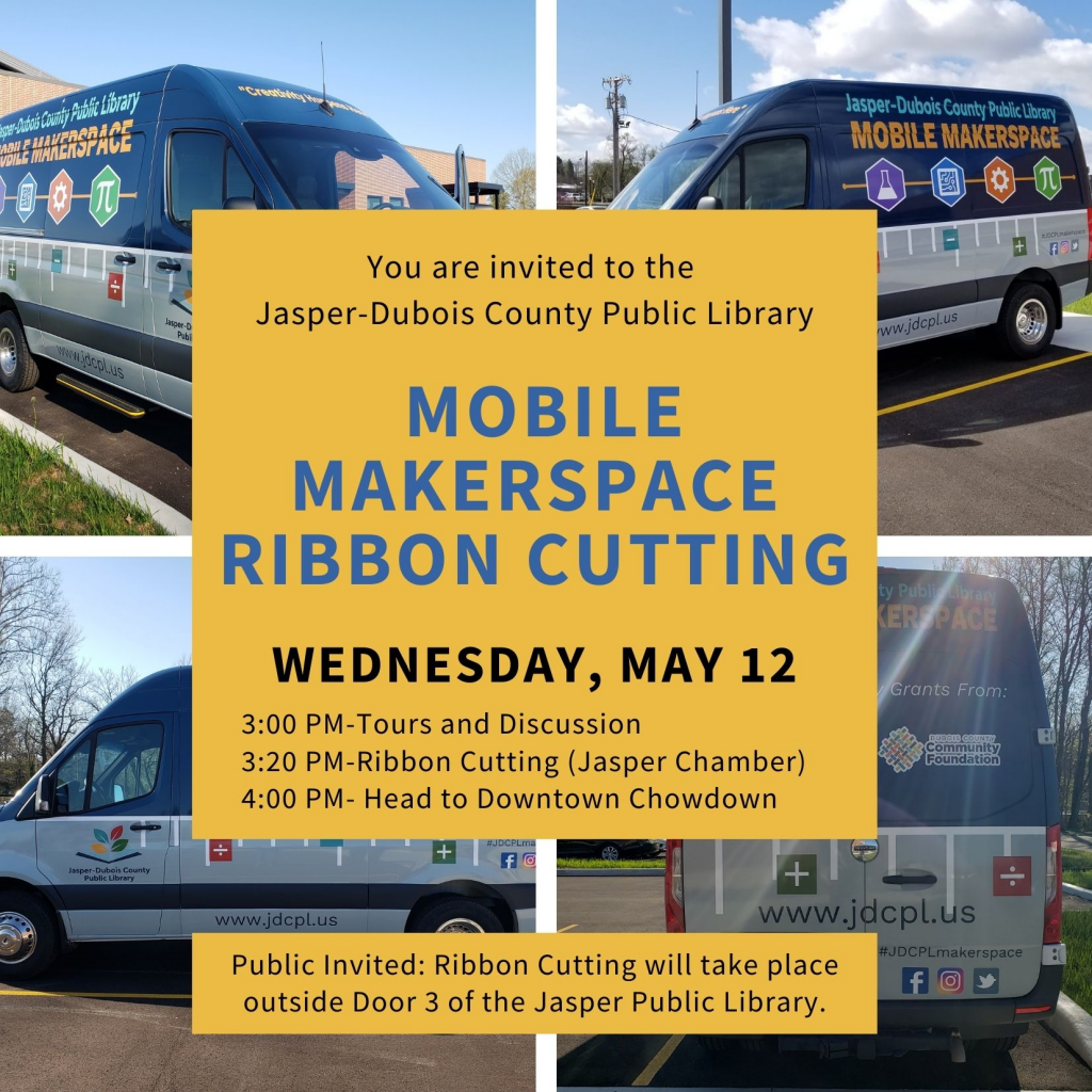 Wednesday, May 12, 2021, at 3 p.m. the public is invited to the Jasper Public Library for the ribbon-cutting. Afterward, the makerspace will be set up at the Downtown Chowdown on the square for a sneak peak of upcoming program that will be made available through the mobile makerspace.
