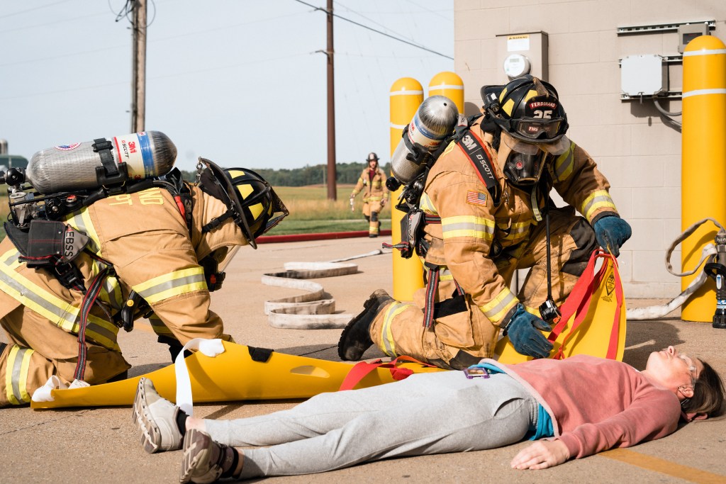 Saturday’s scenario began with a forklift driver having a medical emergency, causing a crash into a bank of industrial batteries. Damage to the batteries resulted in an acid leak, injuring other employees through contact with the acid and inhaling the poisonous fumes. To add to the confusion, a child played by a CPR training dummy was struck by a vehicle along the street next to the factory during the event.
