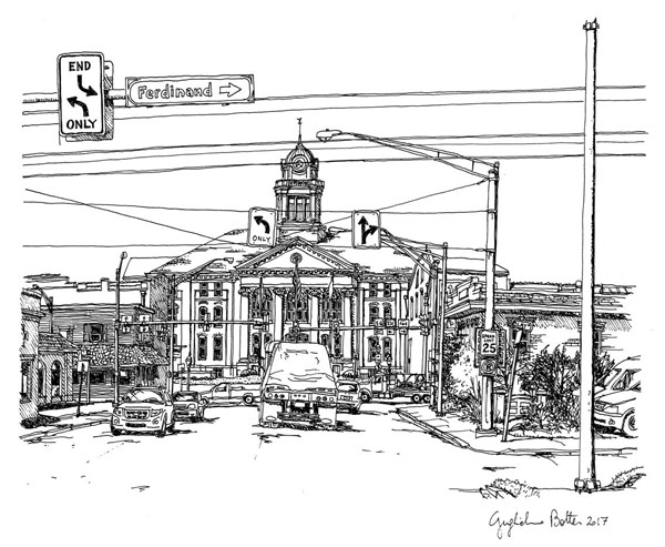 On display with Jay Hamlin is, Guglielmo Botter, an Italian-American citizen born in Treviso, Italy. The sketches in Guglielmo Botter’s series are all images of iconic landmarks in Dubois County. Botter spent quite a bit of time traveling to Jasper throughout the past year capturing photographs of numerous local locations. Those pictures then allowed him to create his many sketches while back home in Italy.