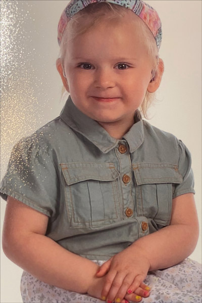 Her giggle was contagious, and those big beautiful blue eyes would melt your heart when she would look at you. She had a very strong-willed side to her too. “Pip pip Cheerio” was her favorite phrase at school, and she was so smart. She was a big fan of Peppa Pig, Elsa and Anna, Maui, Home, and all things Disney.