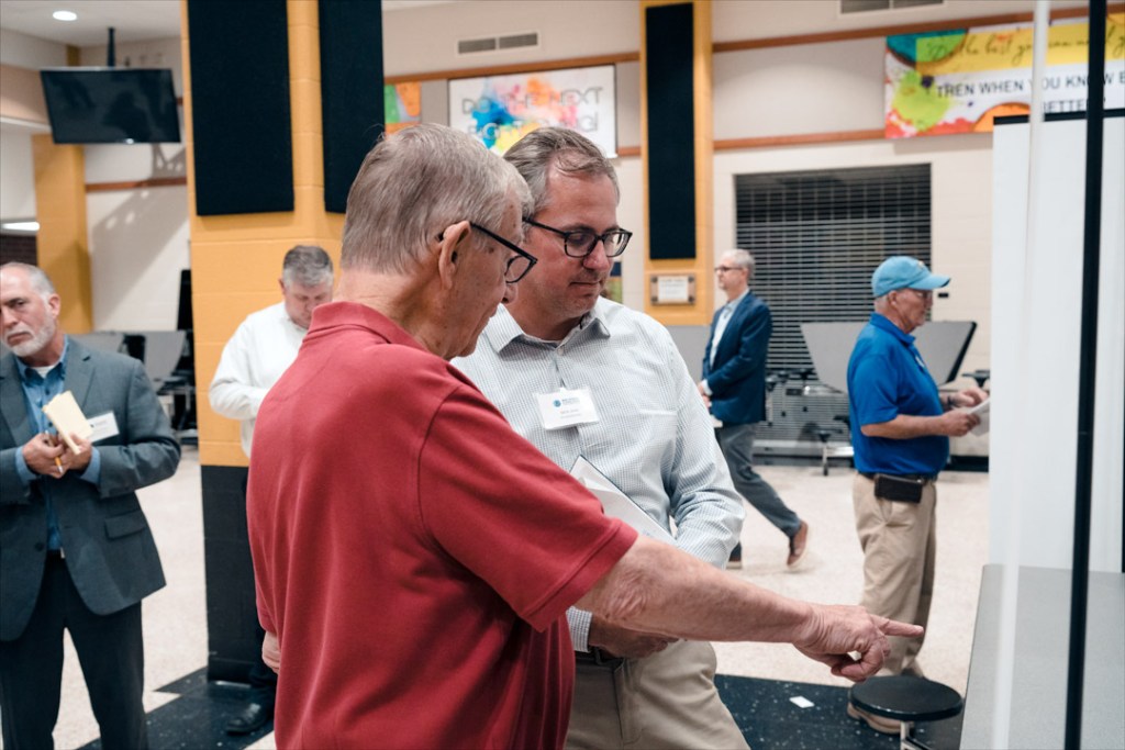 As people moved out into the cafeteria, many continued speaking directly to Jason DuPont, Lochmueller Group’s project manager for the Tier 2 study, and the INDOT representatives as others began moving to the different displays of the Dubois County study area.