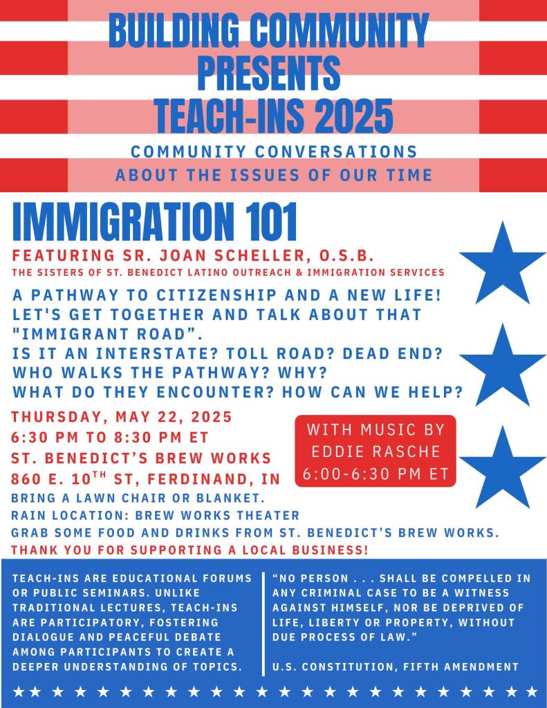 Building Community 2025 is hosting an Immigration 101 event on Thursday, May 22, at 6:30 p.m. at St. Benedict’s Brew Works, 860 E. 10th Street in Ferdinand.