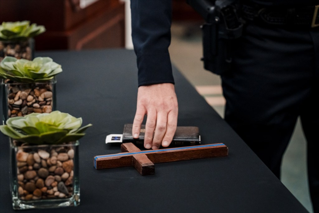 The bible is special and so is the nearby cross adorned with the blue line down its horizontal bar. As he left the Indiana State Police Law Enforcement Academy for the final time Friday, he was gifted it by the director, Tim Horty. Horty had used scraps of wood from the academy to fashion the cross. As Dick was leaving Friday, Horty took it off the wall in his office and handed it to him.