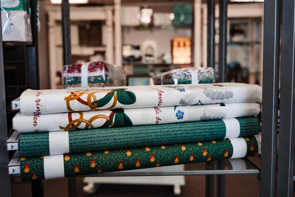 Everything downstairs is designed to support everything upstairs. There you will find all types of fabrics, notions, patterns, binders, yarn, thread, and buttons. She will carry new fabric from popular designers, as well as vintage fabric and buttons she has collected over the years.