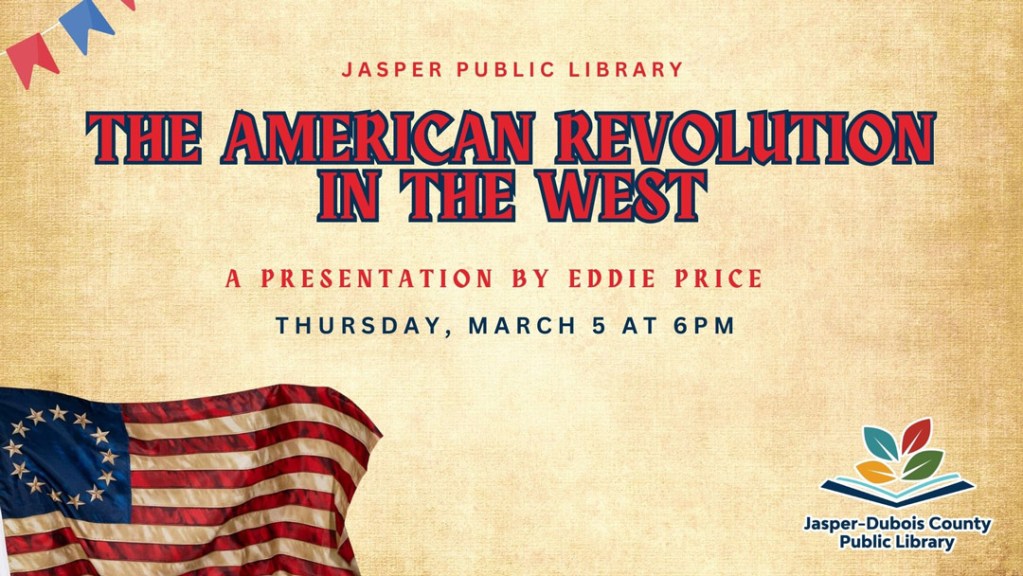 History comes alive at the Jasper Library as historian and author, Eddie Price, presents “The American Revolution in the West” on Thursday, March 5, at 6 p.m. This special event is part of Dubois County’s America 250 programming, commemorating the 250th anniversary of the founding of the United States. This engaging program explores the often-overlooked…