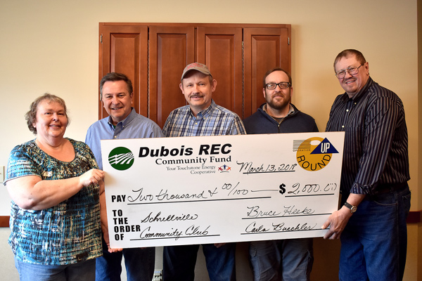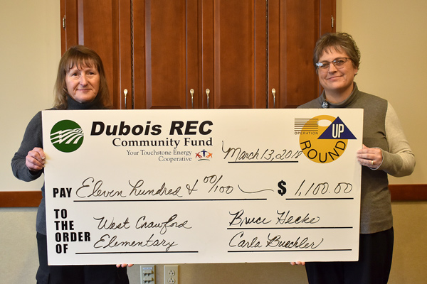 Crisis Connection Inc. received a $1,300 grant for continued training for youth leaders. Dubois REC General Manager/CEO Don Book presents the grant to Kathy Gutgsell and Paula RascheFriends of Otwell/Lil Hoosiers Educational Services received a $1,000 grant to improve their existing preschool program and start a new Pre-K program. Operation Round Up Trustee Patrick Eckerle presents the grant to Jamie Jenkins and Rosemary Rhodes.Northeast Dubois High School Special Education received a $2,000 grant for students to purchase supplies for life skills lessons. Operation Round Up Trustee Bruce Heeke presents the grant to Teaching Assistant Brooke Atkins and students Shilah Hulsman and low-income Smith.Paraclete CEO Ministries was awarded a $2,500 grant to help purchase a cooler to store produce which is later distributed to low income residents, food pantries and other community organizations. Operation Round Up Trustee Elizabeth Englert presents the grant to Patrick Kellems.Schnellville Community Club received a $2,000 grant to upgrade the lighting in their facility to more efficient fixtures. Operation Round Up Trustee Susie Brown presents the grant to Tony Mehringer, Myron Betz, Mark Knust and Don Reckelhoff.St. Patrick’s Celebration, Inc. received a $2,500 grant to help purchase a rotary broom to clean streets and curbs. Operation Round Up Trustee Robin Small presents the grant to Sharon Seifert and Bob Bleemel.West Crawford Elementary School received a $1,100 grant to help fund art and music programs for students. Operation Round Up Trustee Cindy Belcher presents the grant to Becky Weisman.