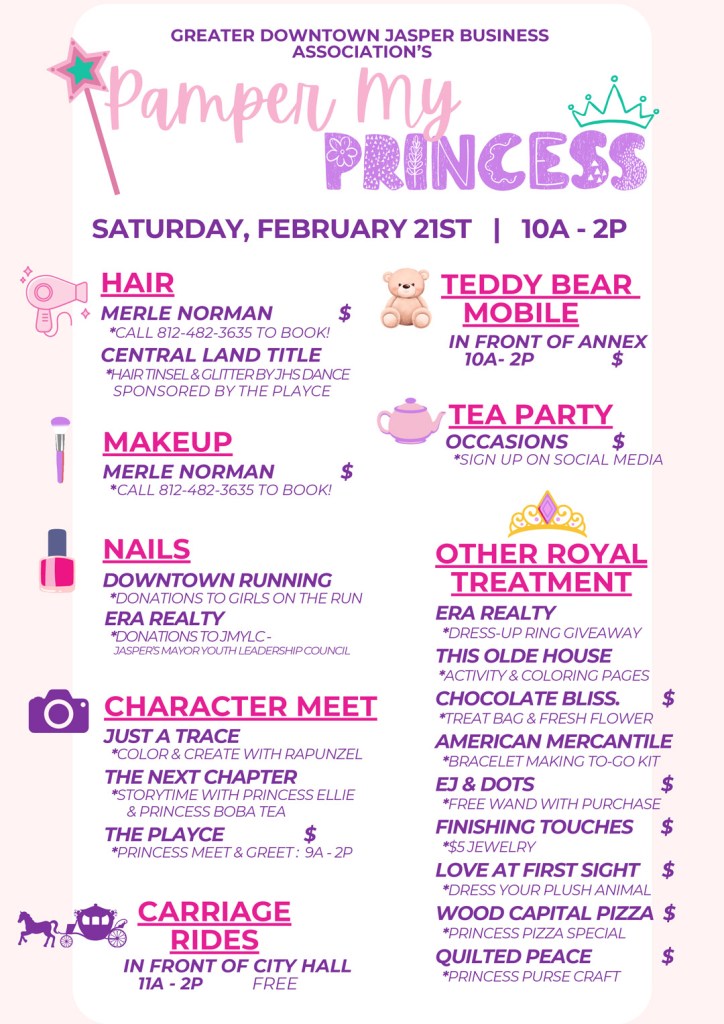 The Greater Downtown Jasper Business Association is hosting the third annual Pamper My Princess event on Saturday, February 21, 2026, from 10 a.m. to 2 p.m. in downtown Jasper.