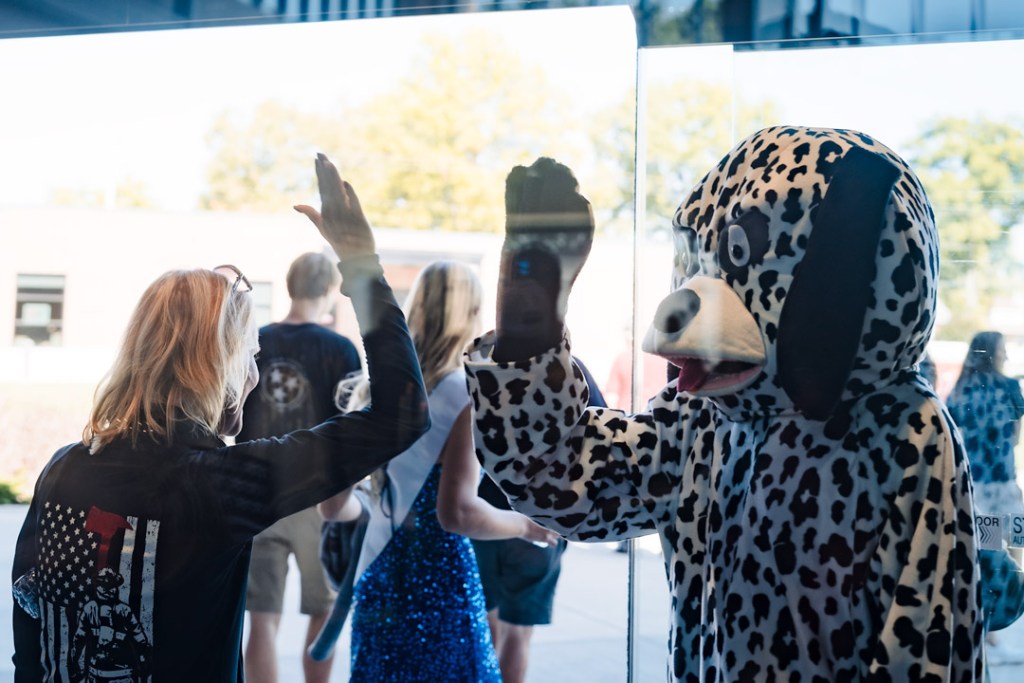 Sparky, played by Tyson Hanselman, gave high-fives as attendees exited the cultural center after the pageant.