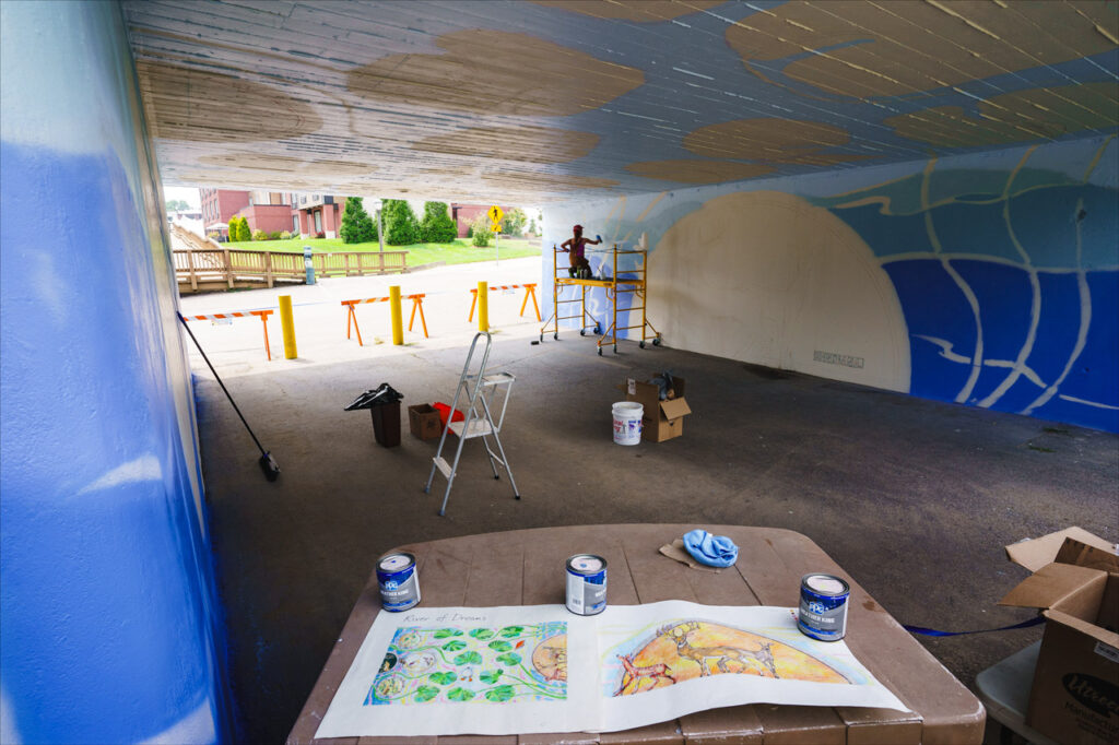 Artist Laura Pommier began working on the new mural titled “River of Dreams” about three days ago. She has been outlining and filling in large swathes of the mural with special spray paints. The underwater scene opens to portals featuring common scenery and wildlife that can be found near Indiana’s waterways.