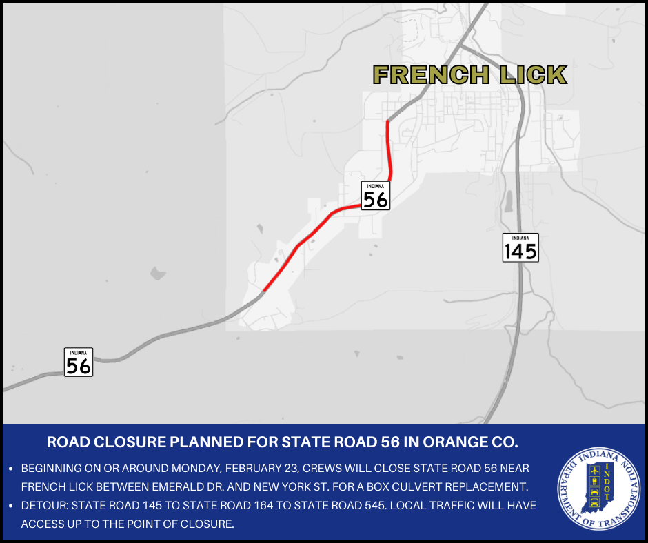 The Indiana Department of Transportation announces a road closure for State Road 56 in Orange County beginning on or around Monday, February 23. Crews will close State Road 56 near French Lick. This closure will occur between Emerald Drive and New York Street.