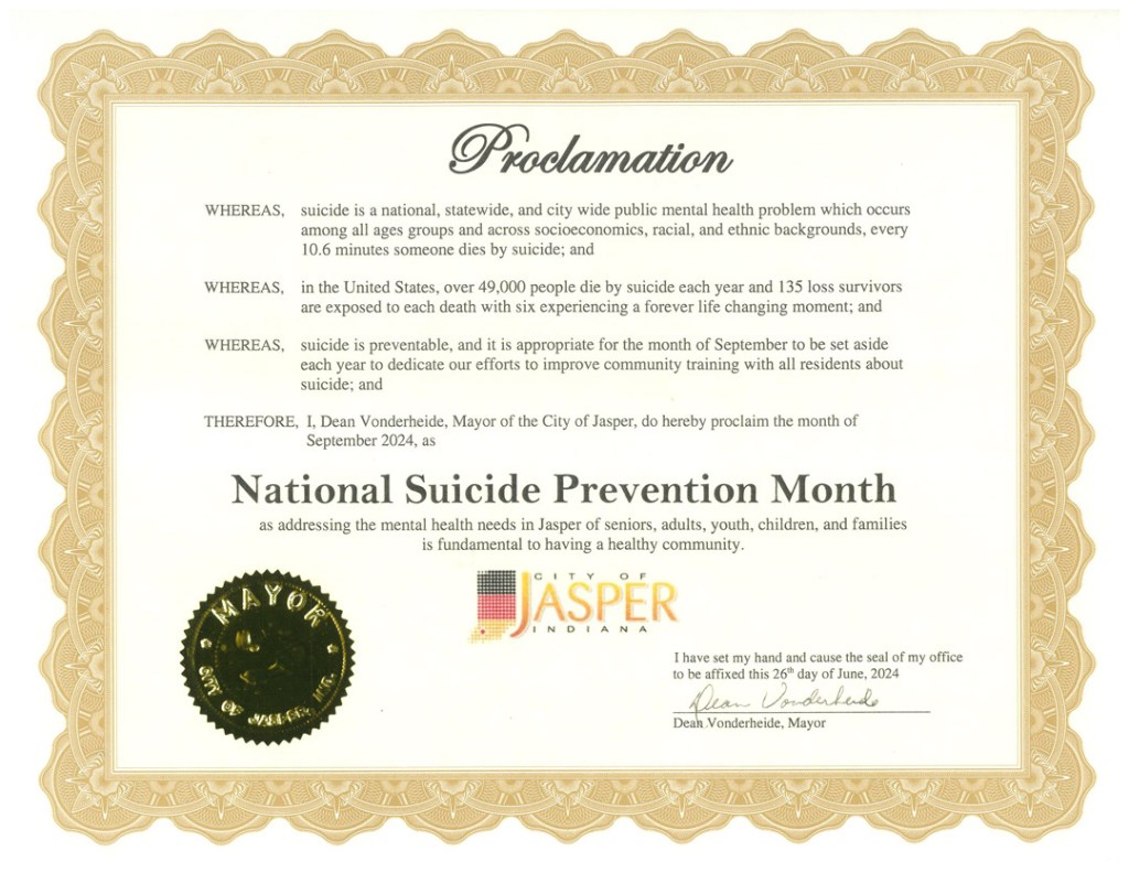 September is Suicide Prevention Month, and Mary Lou is Survivors of Suicide of Dubois County’s Loss Survivor of the Year. She accepted proclamations from the mayors of Jasper and Huntingburg and the Ferdinand Town Council, recognizing the month’s significance in their respective jurisdictions.