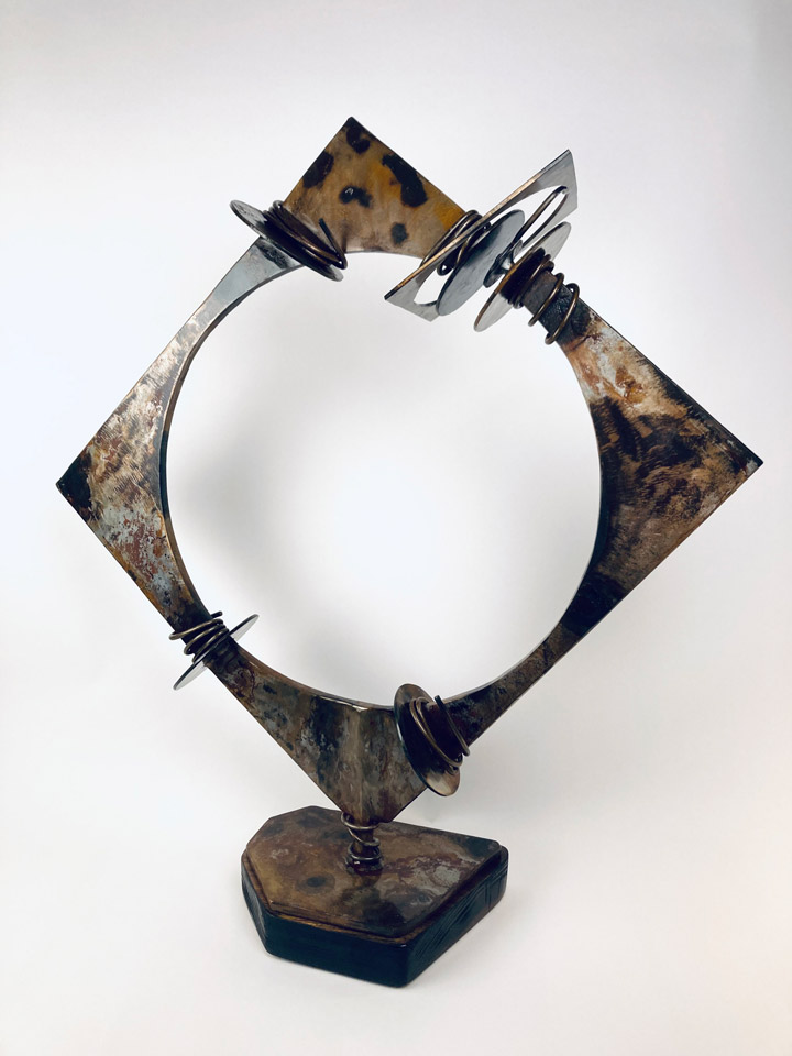 Smith states, “My artwork is a unique combination of industrial materials and elements from nature. I tend to visualize most of my pieces in my head rather than sketching ideas on paper. Through a rather spontaneous process, I create pieces by incorporating metal, wood and other materials into rugged and elegant forms. I strive to create a strong physical presence with all of my sculptures. I have an intuitive gift of relating space in and around my forms. My works serve to bridge the gap between the industrial and natural, combining them to recognize their true beauty.”