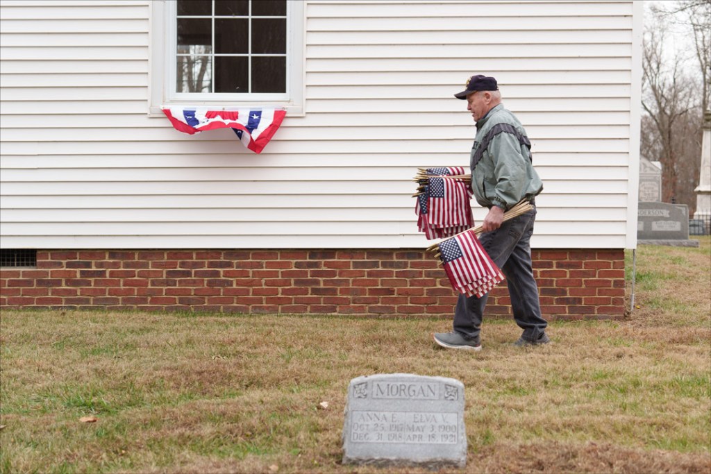 Gary Sermersheim, an 11-year Army Veteran and volunteer, picked up flags from the grave markers after the event.