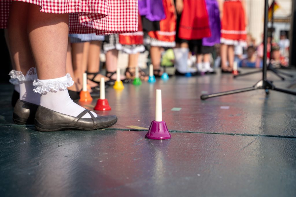 Musical bells sit at the ready on the stage as the Kinderchor sang at the direction of Mary Burke during the German Heritage Night celebration Thursday evening.